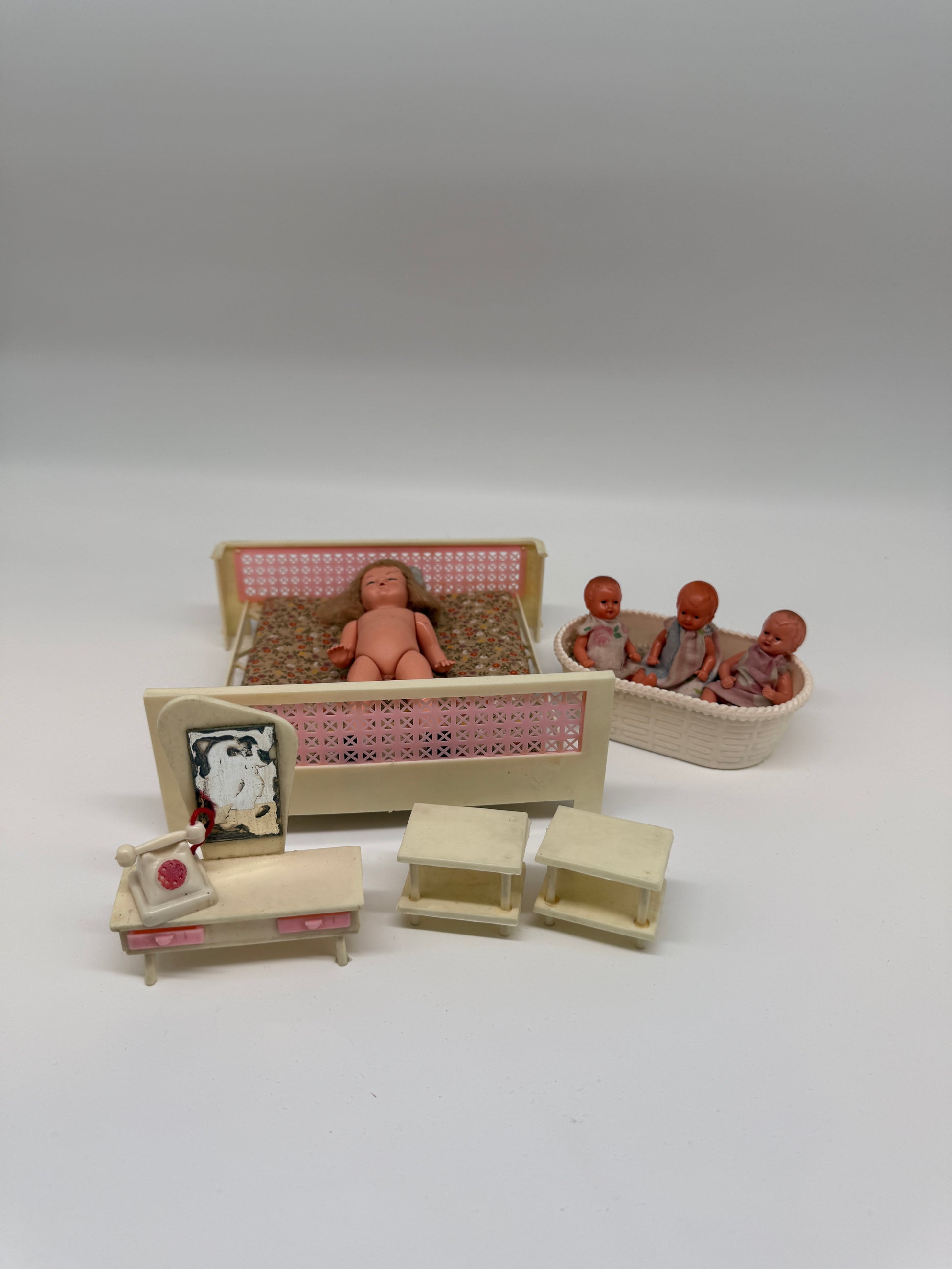 Dieses Set vereint charmante Gebrauchsspuren und authentische Patina – genau das, was echtes Vintage Puppenspielzeug so besonders macht. Ideal zur Dekoration, für Sammlungen oder als Ergänzung zu historischen Puppenhäusern.